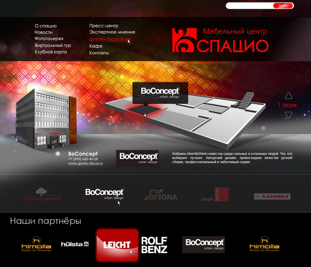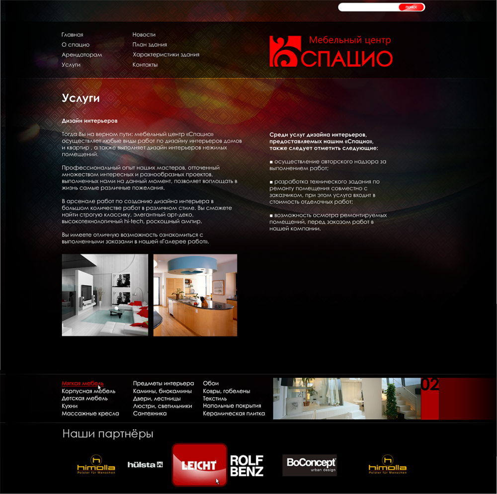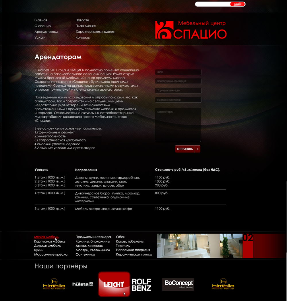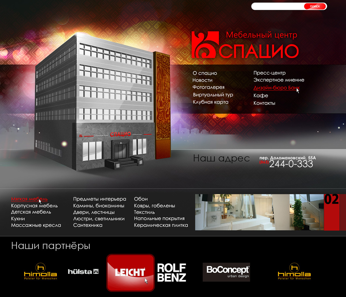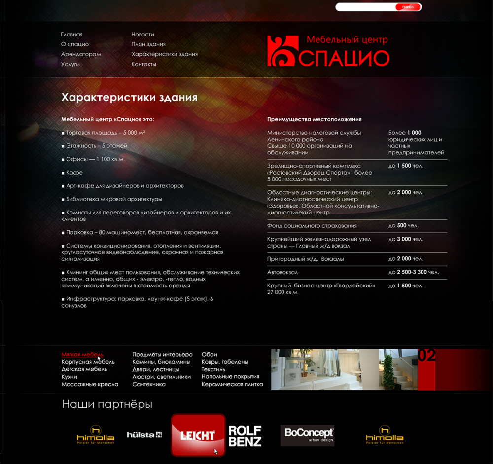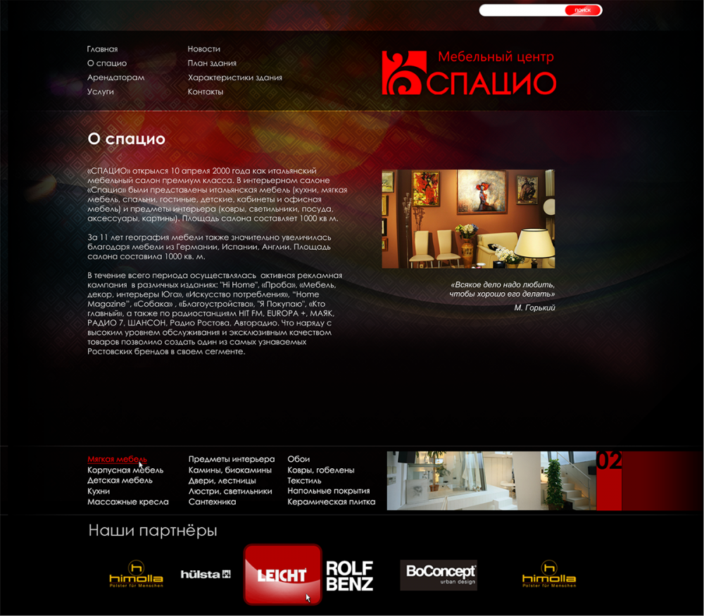 «СПАЦИО» открылся 10 апреля 2000 года как итальянский мебельный салон премиум класса. В интерьерном салоне «Спацио» были представлены итальянская мебель (кухни, мягкая мебель, спальни, гостиные, детские, кабинеты и офисная мебель) и предметы интерьера (ковры, светильники, посуда, аксессуары, картины). Площадь салона составляет 1000 кв м.
