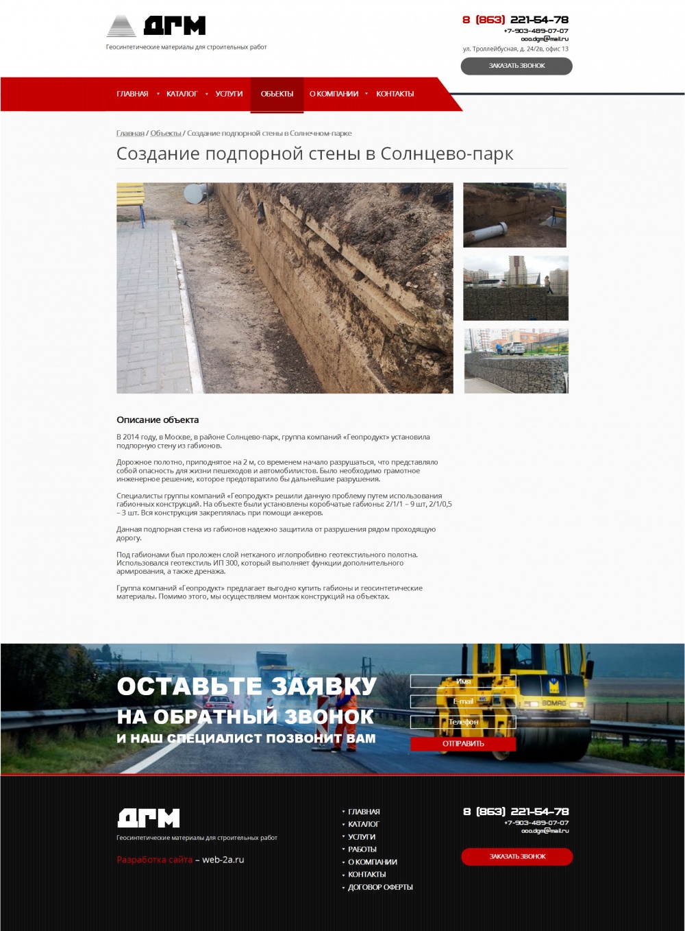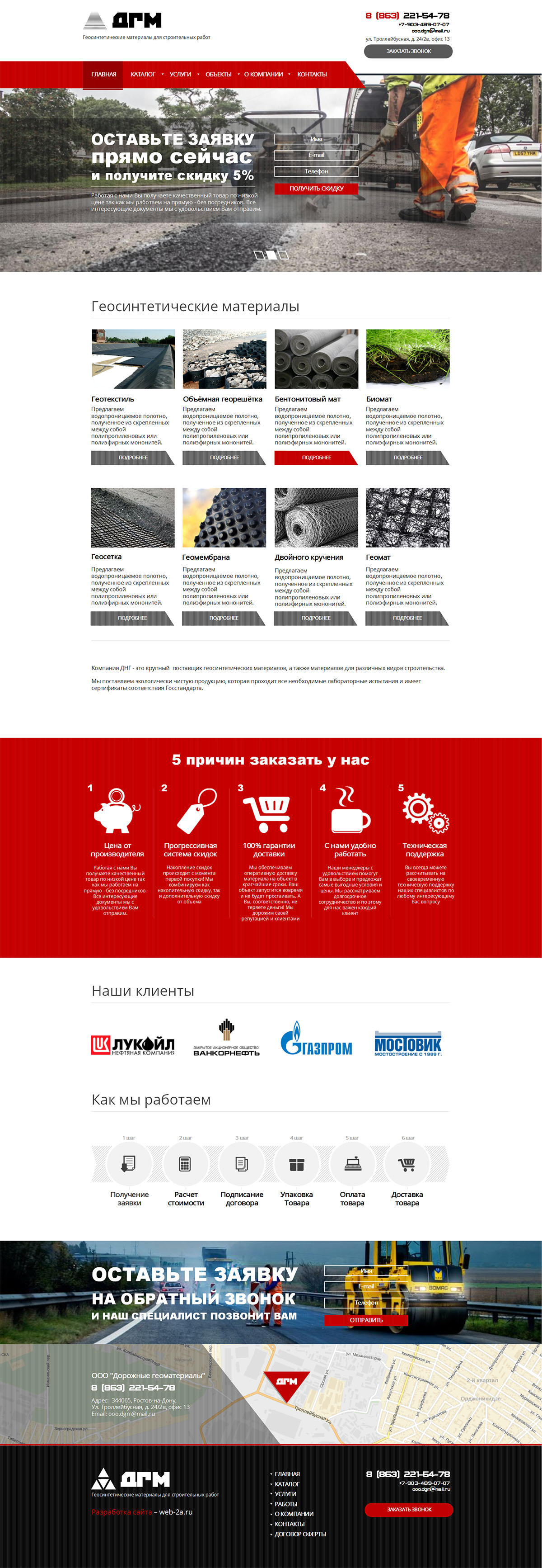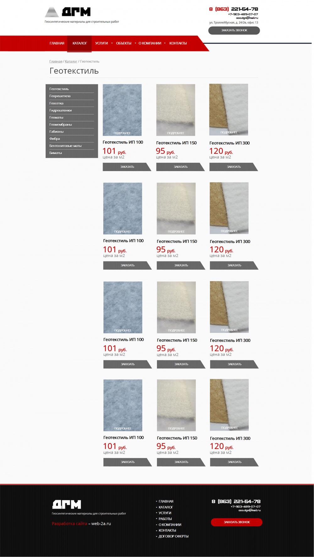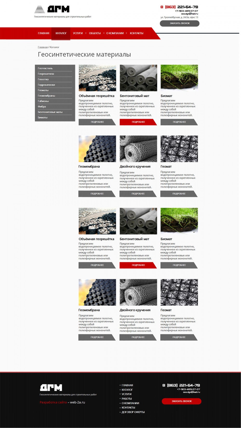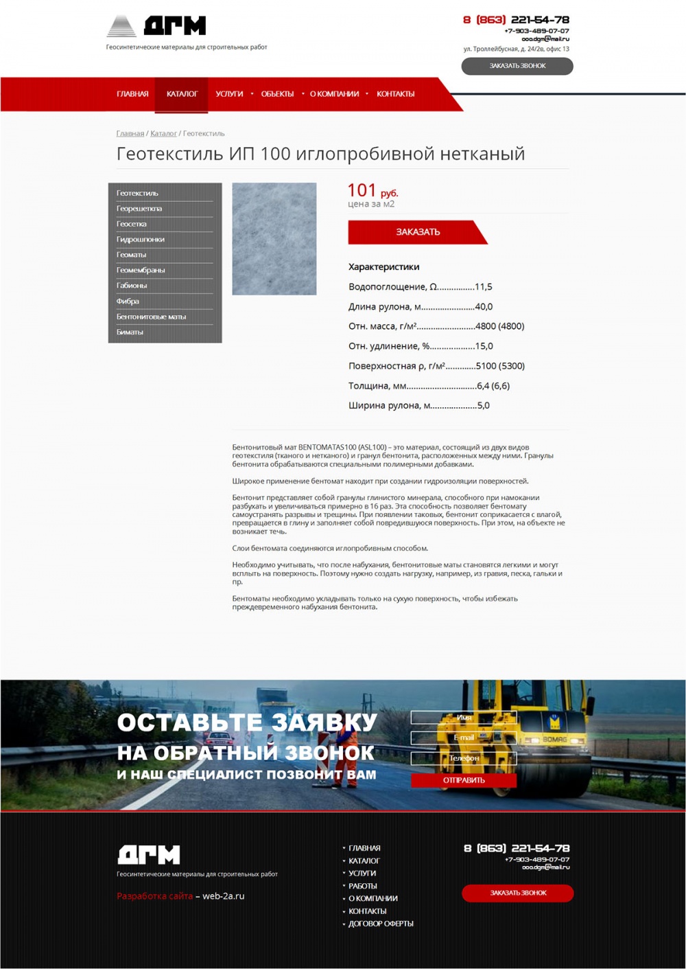 Компания «Дорожные геоматериалы» предлагает широкую линейку геосинтетических и иных строительных материалов. Имеет богатый опыт в сфере работы на рынке геоматериалов, в том числе, работы с крупными проектами, такими как Олимпийские объекты, объекты нефтегазовой добычи, рекреационные объекты.