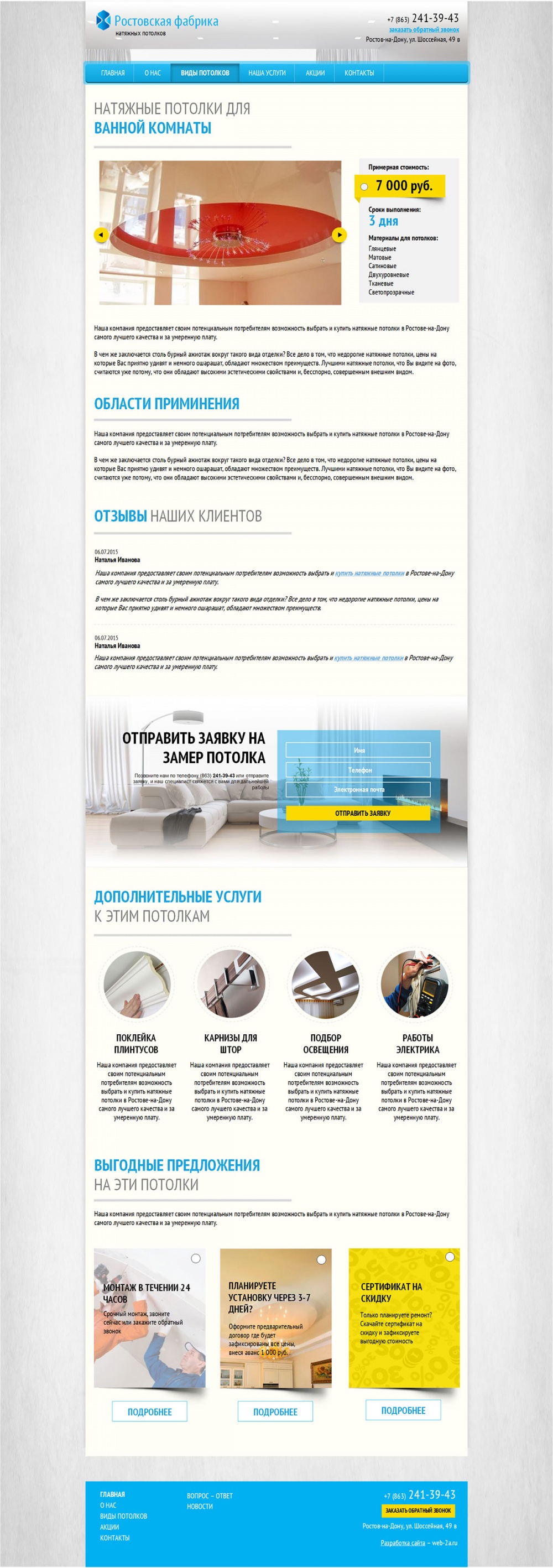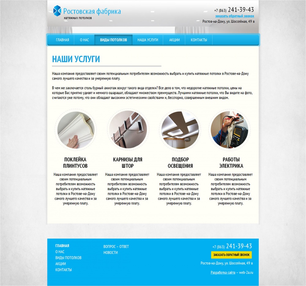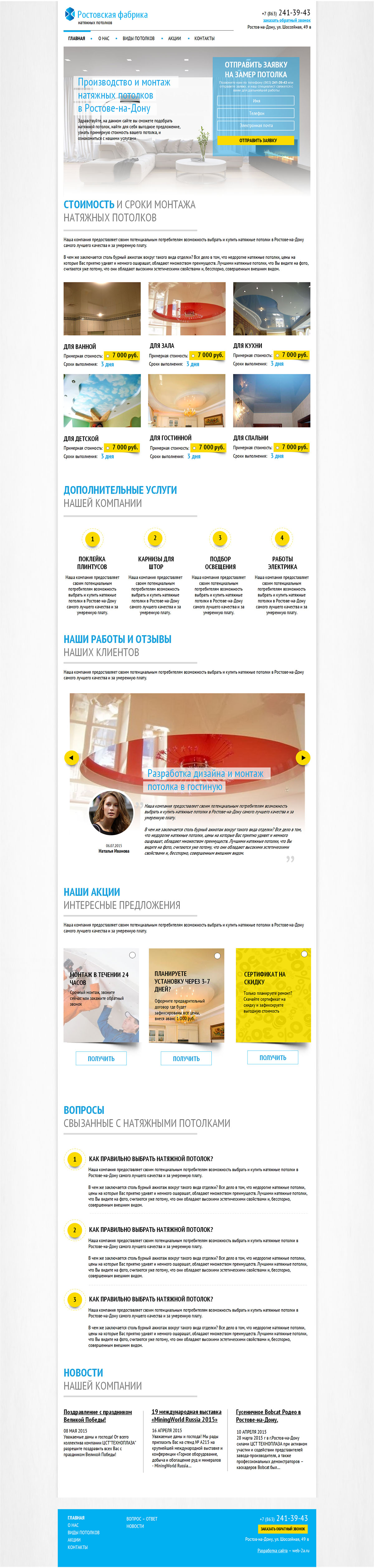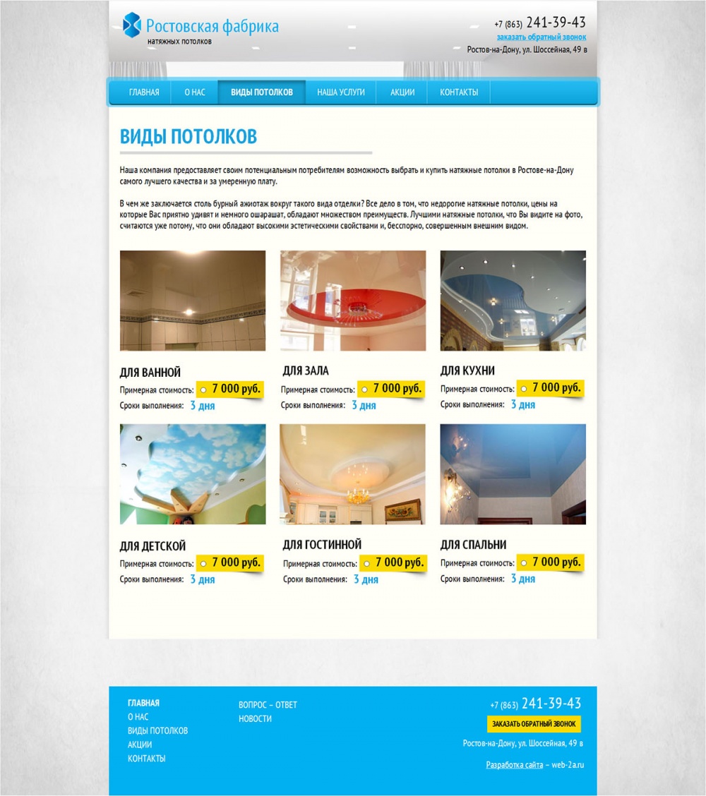 Основное направление деятельности фабрики – изготовление, реализация и установка натяжных потолков. Вот уже на протяжении семи лет фабрика предлагаем своим клиентам натяжные полотна по самой доступной цене.